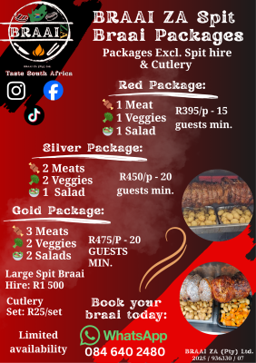 We do spit braais; variety braais and pop-up boerewors roll stall.
